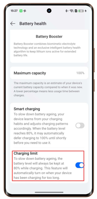 When the phone detects that it has been connected to the charger for a long time, it will remind the user to turn on the charging limit protection and control the maximum power to 80%.