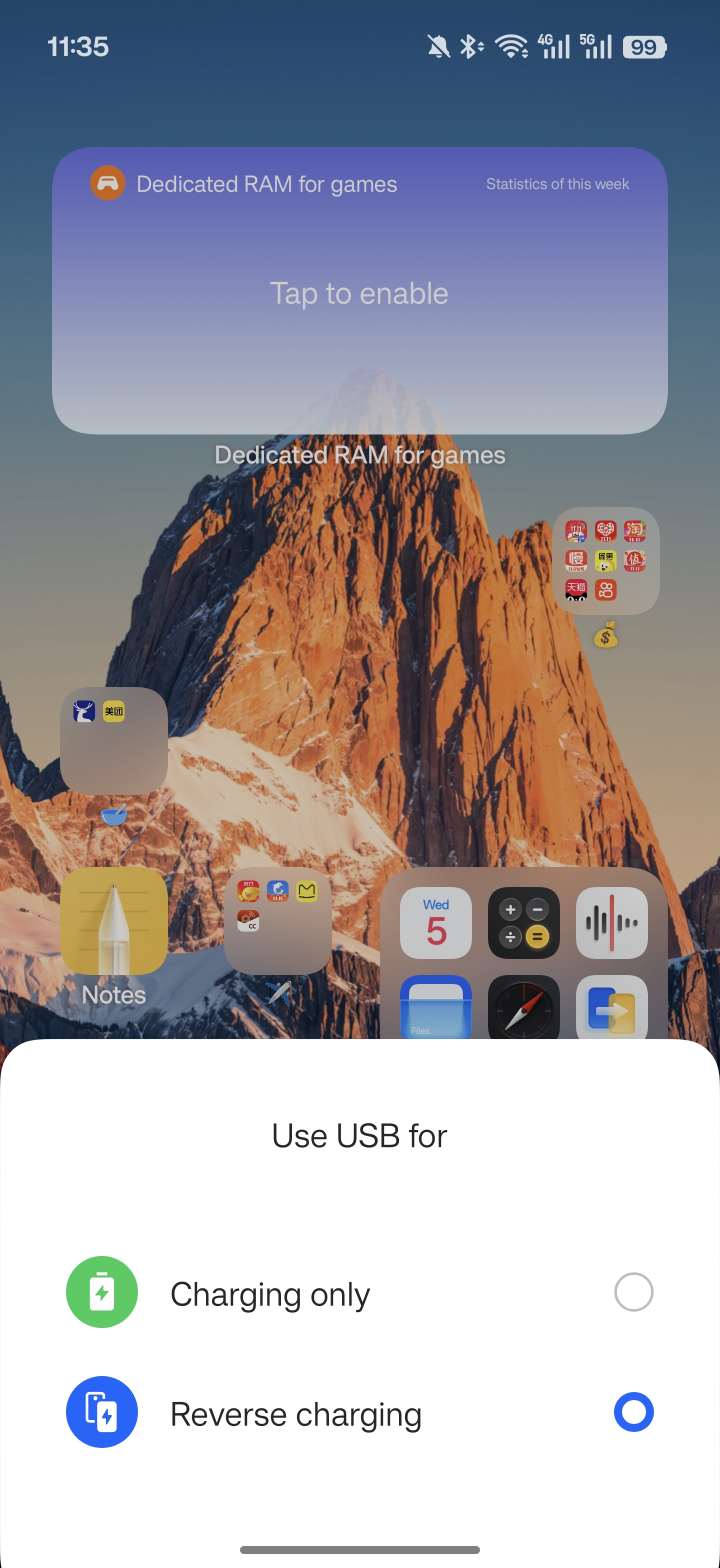 A reverse charging option is added in the USB settings interface, allowing the user to choose whether to use their device as the power supplier or the power receiver.