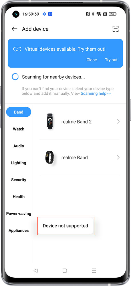 realme Watch 3 Pro prompts "device not supported" when scanning code to bind devices.
