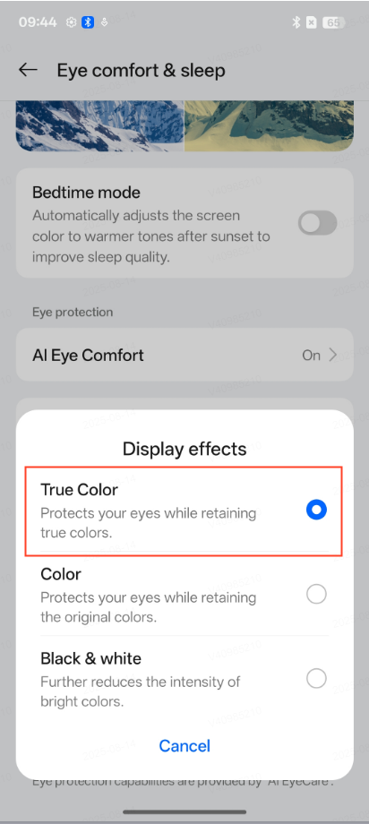 realme UI 7.0 & 6.0: Settings > Display & brightness > Eye comfort > Display effects > True Color