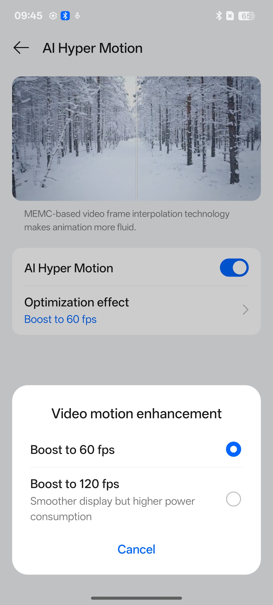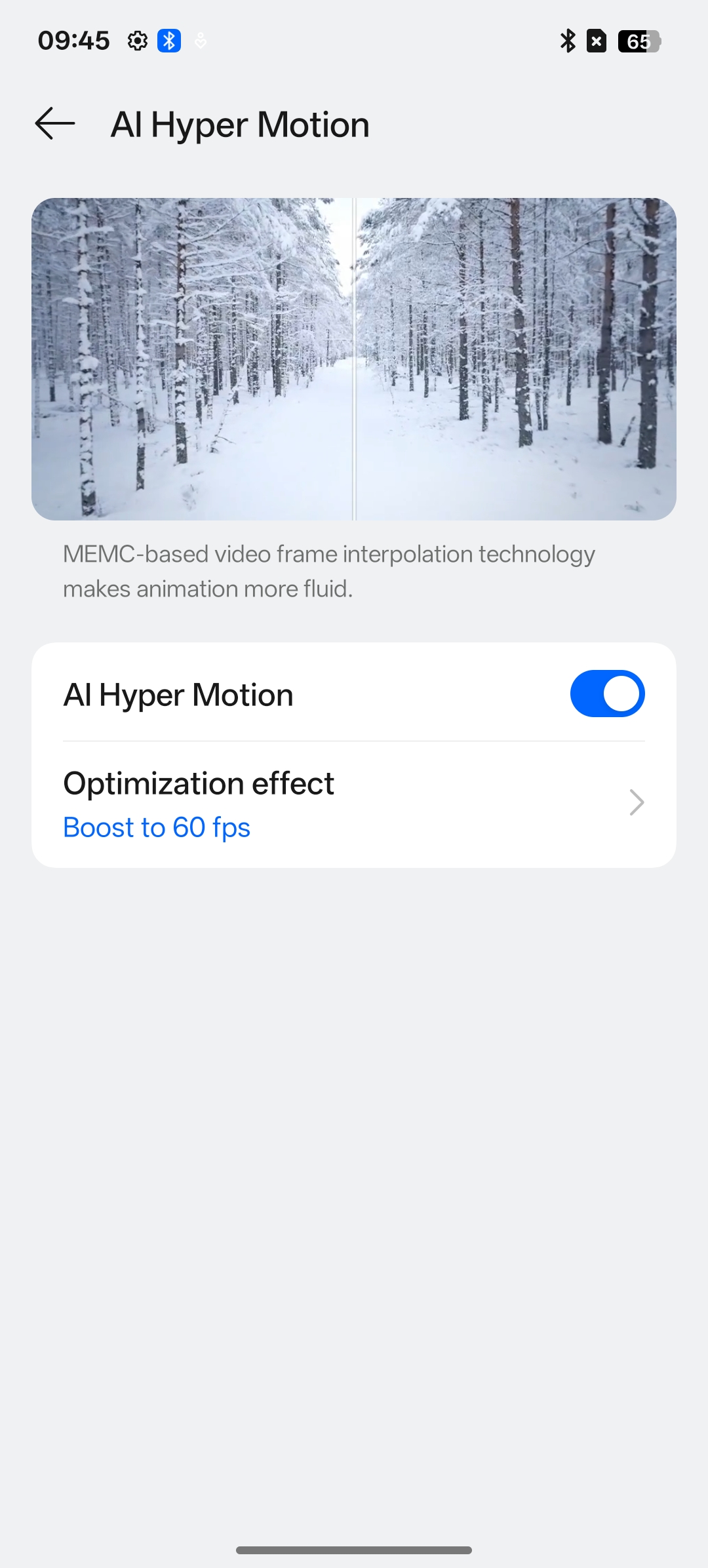 AI Hyper Motion or Video motion enhancement (memc) refers to motion estimation and motion compensation technology, which allows you to watch videos more smoothly and reduce the jitter phenomenon so that the moving picture looks clearer and smoother.