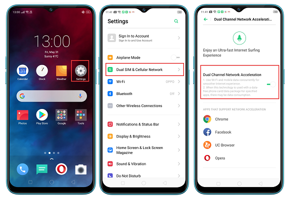 1. Enable dual-channel network acceleration setup pathSettings-->Dual Card & Dual SIM & Cellar Network-->Dual Channel Network Acceleration.