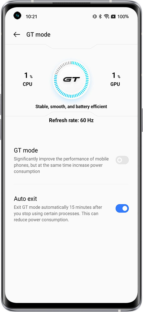 After the auto exit function is enabled, GT mode will automatically exit after you stop using some programs for 15 minutes. Please go to Settings > Battery > GT Mode > Turn off Auto exit.