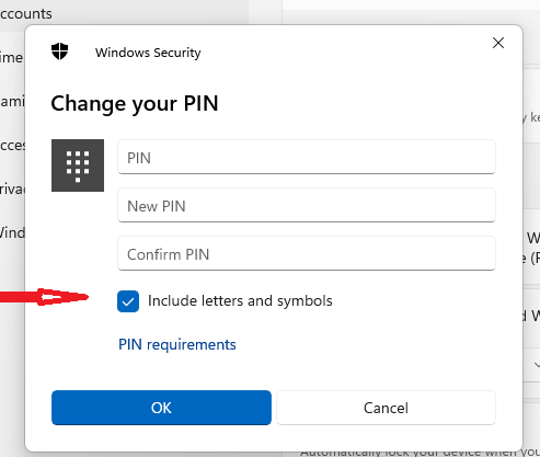 When setting the PIN, check the option of "include letters and symbols" in the window. This will help in setting up passwords in the alphanumeric format.